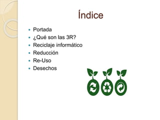 Este documento habla sobre las 3R (reducir, reutilizar y reciclar) y cómo se aplican al reciclaje de computadoras. Explica que la reducción consiste en usar equipos de manera más eficiente, la reutilización implica darle nuevos usos a componentes, y el reciclaje permite reincorporar materiales de desecho en nuevos productos. También menciona las ventajas ecológicas y económicas de seguir las 3R para el cuidado del medio ambiente y el ahorro de recursos.