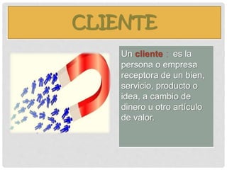 El documento define conceptos clave relacionados con clientes, costos y comunicación. Define al cliente como la persona o empresa que recibe un bien, servicio o idea a cambio de dinero. Explica que el costo de un producto incluye la materia prima, mano de obra directa e indirecta y amortización. Además, enfatiza la importancia de considerar dónde y cómo llegar mejor al cliente con el producto o servicio, y que el ambiente adecuado para la compra puede ser decisivo. Finalmente, señala que la comunicación promueve las ventaj