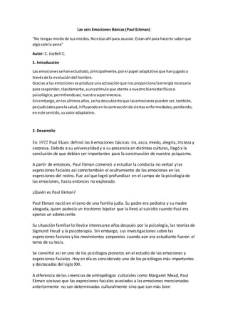 El documento explora las seis emociones básicas definidas por Paul Ekman: ira, asco, miedo, alegría, tristeza y sorpresa, destacando su naturaleza universal y su importancia adaptativa en la supervivencia humana. Además, se menciona cómo Ekman investigó las microexpresiones faciales, que son útiles para detectar emociones ocultas y mentiras, y se relaciona su trabajo con la salud emocional y el sistema inmunológico. Finalmente, se enfatiza la necesidad de reconocer y gestionar nuestras emociones para mejorar el bienestar personal.