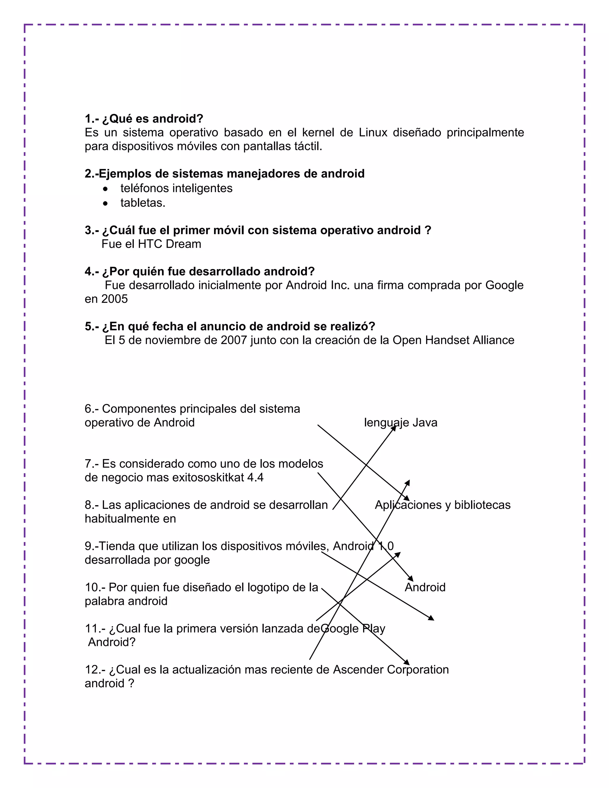 Android es un sistema operativo basado en Linux diseñado para dispositivos móviles con pantallas táctiles como teléfonos inteligentes y tabletas. Fue desarrollado inicialmente por Android Inc. y anunciado en 2007. Algunas de sus versiones más conocidas son Cupcake, Donut, Froyo, Gingerbread, Honeycomb, Ice Cream Sandwich, Jelly Bean y KitKat.