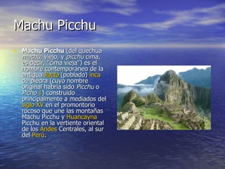 El documento describe 7 maravillas del mundo: 1) Machu Picchu, una antigua ciudad inca construida en los Andes peruanos. 2) El Templo de Kukulkán en Chichén Itzá, México, que servía como calendario agrícola. 3) La estatua de Cristo Redentor en Río de Janeiro. 4) La Gran Muralla China, una antigua fortificación que protegió China. 5) El Taj Mahal en India, construido en honor a la esposa del emperador. 6) Petra en Jordania, la capital