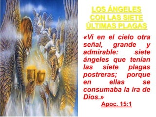 El documento describe las siete últimas plagas que caerán sobre la tierra antes de la segunda venida de Cristo. Las siete plagas serán derramadas por siete ángeles y consistirán en úlceras, sangre en el mar y ríos, calor extremo del sol, oscuridad sobre el trono de la bestia, el secamiento del Éufrates y la batalla final de Armagedón, y por último granizo y terremotos al derramarse la séptima plaga. Estas plagas solo caerán sobre aquellos que hayan recibido la marca