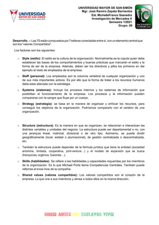 El documento describe el modelo de las 7S de McKinsey, el cual integra 7 factores clave para organizar una empresa de manera efectiva: estructura, estrategia, habilidades, personal, sistemas, estilo y valores compartidos. Estos factores están interconectados y un cambio en uno requiere cambios en los demás. El modelo busca alinear estas 7 áreas para lograr la eficiencia organizacional.