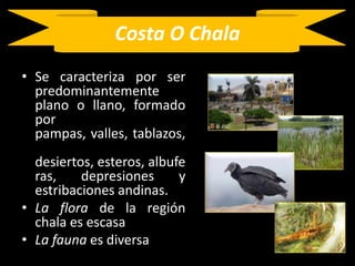 El documento describe las 8 regiones geográficas del Perú, incluyendo la Costa, Yunga, Quechua, Suni, Puna, Janca, Rupa Rupa y Omagua. Cada región se caracteriza por su relieve, clima y flora y fauna distintiva. La Costa es llana y árida, mientras que la Yunga, Quechua y Suni tienen valles fértiles. La Puna y Janca son mesetas y montañas frías. La Rupa Rupa y Omagua forman la selva amazónica caliente y húmeda.