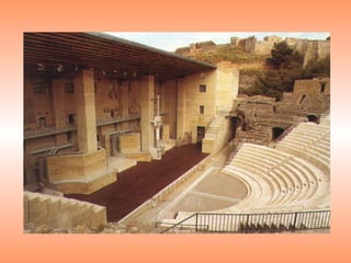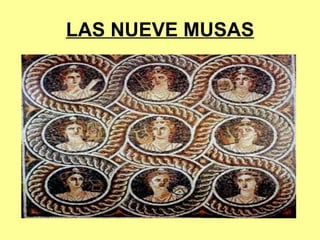 El documento resume las nueve musas de la mitología griega, sus atributos y dominios. También describe un mosaico romano hallado en España que representa a las nueve musas, y brinda información sobre ciudades romanas en España como Edeta, Saguntum e Ilici, incluyendo restos arqueológicos conservados.