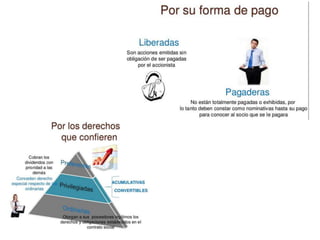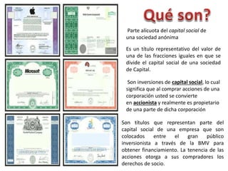 Una acción es un título corporativo que representa una parte del capital social de una sociedad anónima. Al comprar acciones, los inversionistas se convierten en accionistas y dueños parciales de la corporación. Las acciones otorgan derechos de voto en asambleas y posibles dividendos a sus propietarios.