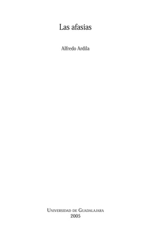 El documento del Dr. Alfredo Ardila aborda la afasia desde una perspectiva histórica y clínica, explorando su desarrollo, clasificaciones, y síntomas asociados. Se detalla el daño cerebral relacionado con diferentes tipos de afasia, proporciona casos de estudio y sugiere métodos de evaluación y rehabilitación. Además, se examinan trastornos asociados y aspectos psiquiátricos en pacientes afásicos.