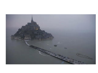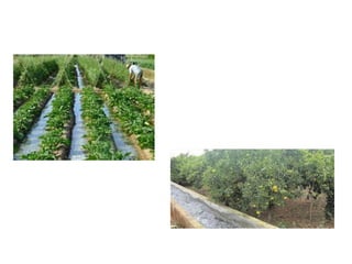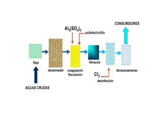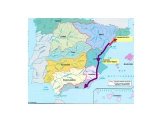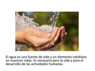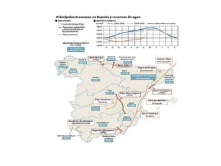 El documento proporciona información sobre los diferentes tipos de aguas en la Tierra. Explica que la hidrosfera incluye aguas dulces y saladas, y describe el ciclo hidrológico. También detalla los usos del agua para abastecimiento, regadío, energía e industria, así como los principales problemas relacionados con la escasez y contaminación del agua.