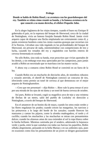 Este documento narra cómo Robin Hood se convirtió en un proscrito. Cuando era joven, Robin participó en un concurso de tiro donde derrotó a unos guardabosques reales. Esto enfureció a uno de los guardabosques, quien disparó una flecha a Robin, pero lo erró. Robin contraatacó acertando al guardabosque, matándolo. Debido a esto y a haber cazado un ciervo real, Robin se convirtió en un fuera de la ley y tuvo que refugiarse en el bosque de Sherwood, donde vivir