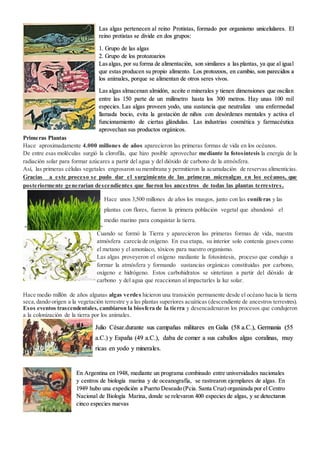 Las algas fueron las primeras plantas que evolucionaron hace aproximadamente 4,000 millones de años. Algunas algas verdes hicieron la transición de los océanos a la tierra hace medio millón de años, dando origen a la vegetación terrestre. Las algas pueden ser unicelulares o pluricelulares, y se clasifican en algas verdes, pardas y rojas. Cumplen un papel importante en la industria alimentaria y farmacéutica.