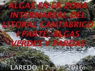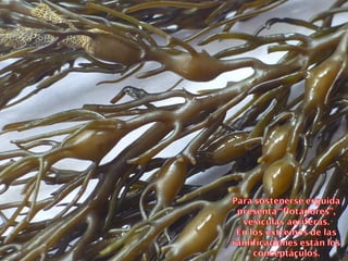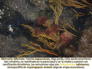 El documento describe diferentes tipos de algas marinas. Explica que las algas viven en el medio marino y de agua dulce, y que existen algas unicelulares y pluricelulares. Se enfoca en las macroalgas marinas bentónicas que viven fijadas al sustrato en la zona intermareal, incluyendo descripciones e imágenes de varias especies como Ulva, Fucus y Cystoseira.