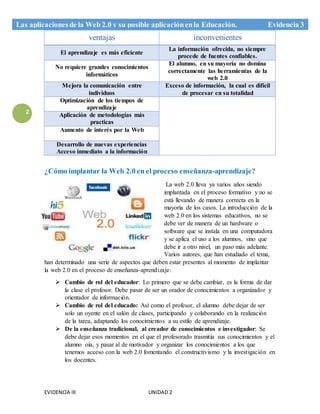 La Web 2.0 ofrece numerosas herramientas como blogs, wikis, redes sociales y plataformas virtuales que pueden aplicarse en educación. Esto requiere cambiar el rol del profesor a organizador de información y del alumno a colaborador activo. Además, se debe cambiar la metodología a un enfoque basado en la investigación y el constructivismo, capacitar a los profesores y desarrollar nuevas competencias en los estudiantes para buscar y procesar información. La Web 2.0 permite mejorar la comunic