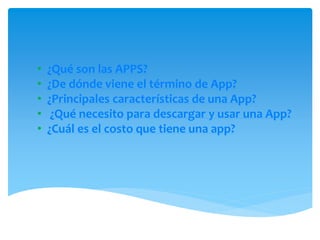 Las Apps son pequeños programas que realizan funciones específicas como juegos, calculadoras u otros. Deriva del término inglés "application". Se han popularizado con los smartphones y existen millones en tiendas de aplicaciones. Suelen solucionar necesidades prácticas de forma sencilla y fácil de usar, e invitan a compartir con otros a través de redes sociales.