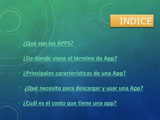 Este documento define qué son las aplicaciones móviles (apps), sus principales características y cómo descargarlas y usarlas. Las apps son pequeños programas que realizan funciones específicas como juegos o herramientas de productividad. Suelen estar disponibles en tiendas de aplicaciones de plataformas como Android e iOS y satisfacen necesidades prácticas de los usuarios de forma sencilla.
