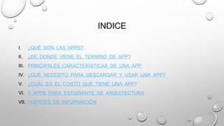 Este documento describe qué son las apps, su origen y características principales. También explica los requisitos para descargar e instalar apps, su costo y recomienda 5 apps útiles para estudiantes de arquitectura como Autodesk FormIt, Architizer, Archisketch, Morpholio Trace y Remodelista. Por último, incluye fuentes de información adicional sobre apps.