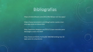 Las aplicaciones móviles (apps) son programas diseñados para realizar tareas específicas en dispositivos móviles como teléfonos y tabletas. Se diferencian de otros tipos de programas como sistemas operativos y lenguajes de programación. Las apps deben ser fáciles de usar, resolver necesidades prácticas de los usuarios, permitir la interacción social y estar disponibles en múltiples plataformas para ser exitosas. Crear una app simple cuesta entre 700-3,000 euros, mientras que aplicaciones más complejas o jue