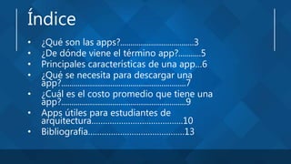 El documento ofrece una introducción sobre las aplicaciones móviles, describiendo su definición, origen del término 'app' y características principales. También se detalla el proceso de descarga y el costo promedio de las apps en diferentes plataformas, así como recomendaciones de aplicaciones útiles específicamente para estudiantes de arquitectura. Finalmente, se menciona la disponibilidad y funcionalidad de estas aplicaciones en dispositivos móviles.