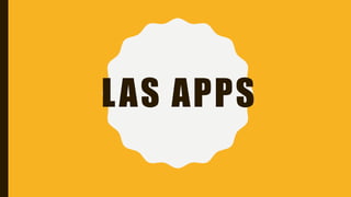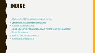 Las aplicaciones móviles, conocidas como apps, son programas diseñados para ejecutar funciones específicas en dispositivos móviles. Se pueden descargar a través de tiendas en línea según el sistema operativo del dispositivo y su costo puede variar ampliamente. El documento también menciona varias aplicaciones útiles para la arquitectura, destacando sus características y funciones.