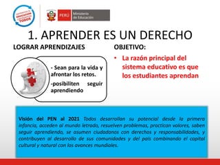 El documento describe los desafíos del sistema educativo peruano para garantizar el derecho a la educación y lograr aprendizajes de calidad para todos los estudiantes. Señala que factores como el currículo, la práctica pedagógica, y la gestión escolar influyen en los aprendizajes, y que se requiere reformar las instituciones educativas para avanzar hacia una "escuela que queremos" centrada en los aprendizajes, la atención a la diversidad, y la cooperación. El objetivo es que todos los estudiantes