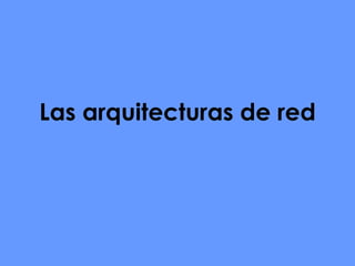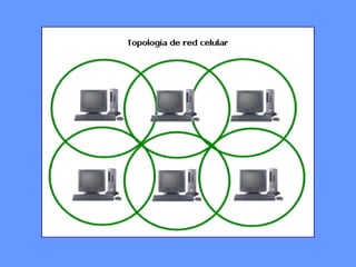 Este documento describe diferentes tipos de arquitecturas de red, incluyendo bus, anillo, estrella y celular. Explica que en una red de bus la información se propaga por un solo cable alcanzando a todos los nodos, mientras que en un anillo la información viaja en una sola dirección. En una red estelar cada computadora se conecta a un concentrador central. Una red celular usa división de frecuencias o códigos para permitir que estaciones distingan las señales. También describe diferentes dispositivos de red como adaptadores, concentradores