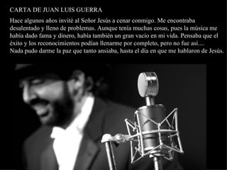 Juan Luis Guerra se encontraba desalentado y con problemas a pesar de su éxito y fama musical. Nada podía darle la paz que buscaba hasta que conoció a Jesús, quien sanó sus heridas y le dio salvación, amor y paz. Ahora Juan Luis Guerra invita a otros a invitar a Jesús a cenar y dejar que Él coloque las cosas en su lugar y llene el corazón.