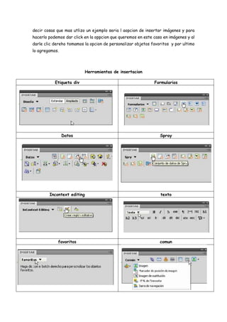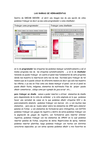 Este documento describe las barras de herramientas en el programa Dream Driver. Ofrece opciones para trabajar como programador o diseñador. Como programador, el programa genera etiquetas automáticamente, mientras que como diseñador se puede personalizar el panel de inserción para agregar elementos como fechas, imágenes y código. También permite agregar elementos de diseño como DIV y posicionamiento absoluto, así como usar formularios y datos de Spry para crear paneles e interacción. El documento explica cómo agregar elementos favoritos para acceder rápidamente a opciones comunes y cómo el