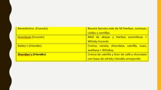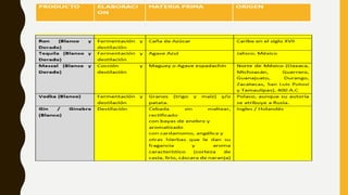 Este documento describe los procesos de elaboración de diferentes tipos de bebidas alcohólicas como destilados, licores y cremas. Explica que los destilados se producen mediante la destilación de líquidos para separar el alcohol, mientras que los licores y cremas se hacen aromatizando y endulzando bebidas destiladas. Además, clasifica los destilados según su color, materia prima y lugar de producción, e indica las diferencias entre licores y cremas en función de su contenido de azúcar.
