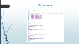 Este documento describe varias bibliotecas importantes para C++. Explica que las bibliotecas contienen código predefinido para funciones comunes como E/S y matemáticas. Luego describe bibliotecas específicas como la biblioteca matemática, la biblioteca de números aleatorios, la biblioteca gráfica y la posibilidad de definir bibliotecas propias. Finalmente resume las bibliotecas estándar más usadas como fstream, stdio, stdlib y las partes de la STL relacionadas a cadenas, vectores y listas