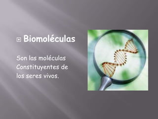 Este documento describe las biomoléculas y sus propiedades. Explica que las biomoléculas son moléculas constituyentes de los seres vivos y están compuestas principalmente de carbono, hidrógeno, oxígeno y nitrógeno. Luego describe las cuatro principales biomoléculas - proteínas, glúcidos, lípidos y ácidos nucleicos - y sus estructuras a nivel molecular. Finalmente, destaca la importancia de estas biomoléculas y otras sustancias inorgánicas para el correcto funcionamiento del cuerpo