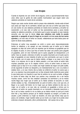 La leyenda de la bruja de San Simón narra la experiencia de un hombre que vio una veladora encendida en medio de la carretera y escuchó una advertencia sobre el peligro de tocarla. Tras ignorar la advertencia, su hijo enfermó y murió, lo que llevó a la pareja a descubrir un guajolote que se transformó en la mujer que el hombre había soñado. La leyenda advierte que tocar o apagar la veladora puede traer consecuencias fatales para la familia.