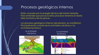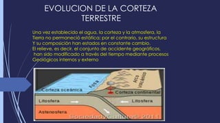 Este documento describe la evolución de la corteza terrestre a través del tiempo debido a procesos geológicos internos y externos. Los procesos internos incluyen la actividad volcánica y tectónica, causados por la energía térmica del interior de la Tierra. La actividad tectónica involucra el movimiento de placas tectónicas que convergen y divergen, formando características como dorsales oceánicas, montañas y fallas. Los procesos externos, como la meteorización y la denudación