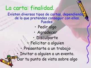 El documento proporciona información sobre cómo escribir una carta de solicitud. Explica que una carta de solicitud debe incluir ocho elementos esenciales: fecha, nombre del remitente, dirección, destinatario, motivo de la solicitud, importancia de la solicitud, detalles sobre la respuesta y fórmula de cortesía. Además, guía al lector a través de siete etapas para escribir una carta de solicitud, que incluyen borradores, revisiones y reescrituras para mejorar la carta.