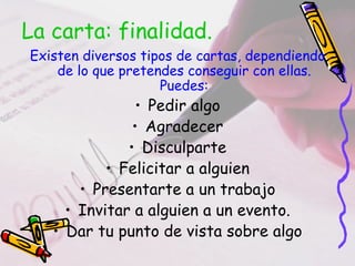 El documento describe los diferentes tipos de cartas y sus características, incluyendo cartas de agradecimiento, disculpa, solicitud, felicitación, presentación e invitación. Explica la estructura básica de una carta, que incluye fecha, vocativo, cuerpo, despedida y firma. Luego, se enfoca específicamente en la carta de solicitud, detallando los elementos que debe contener como quienes son, destinatario, lo que se solicita y cómo/cuándo recibir una respuesta.