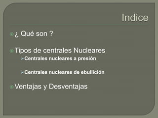 Este documento describe los tipos principales de centrales nucleares, sus componentes y cómo generan energía eléctrica a partir de la fisión nuclear. Explica que hay dos tipos: centrales de presión y de ebullición, las cuales difieren en cómo se genera el vapor para mover las turbinas. También resume las ventajas de las centrales nucleares como no emitir CO2 y reducir la dependencia de combustibles fósiles, así como sus desventajas como la producción de desechos radiactivos y el alto costo.
