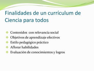 El documento analiza la inclusión de las ciencias en el currículum escolar y los desafíos que esto representa para los educadores. Berta Marco examina los alcances y limitaciones de la ciencia en el plan de estudios. Se argumenta que es necesario identificar rasgos para satisfacer los requisitos educativos en general y para la formación científica, así como establecer objetivos de aprendizaje efectivos y desarrollar habilidades a través de una evaluación de conocimientos. Finalmente, se sugiere que los profesores deben considerar líne