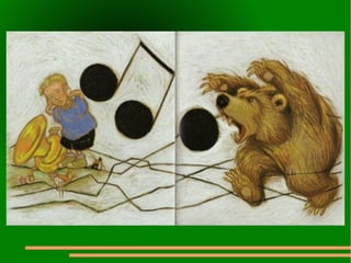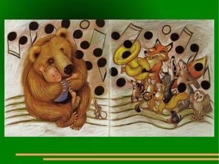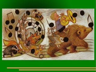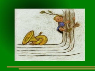 Pedro siempre llegaba tarde a sus clases de tuba porque se distraía jugando y explorando. Un día, después de jugar mucho, se quedó dormido y despertó al sonido de unos animales. Tomó su tuba y comenzó a tocar una melodía que hizo bailar a los animales. Luego se unió a la fiesta un sonido fuerte y desagradable, por lo que alguien tuvo que hacer algo.