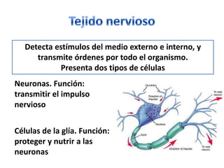 Las células humanas tienen tres estructuras comunes: membrana plasmática, citoplasma y núcleo. Dentro de las células se encuentran diversos orgánulos como la mitocondria, el retículo endoplasmático y el aparato de Golgi. Las células se agrupan formando tejidos como el epitelial, conectivo, muscular y nervioso. Estos tejidos a su vez forman los distintos sistemas y aparatos del cuerpo humano encargados de funciones vitales.
