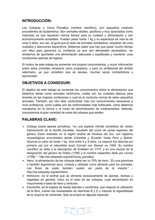 El documento detalla información sobre las cobayas (Cavia porcellus), incluyendo su origen, cuidados, alimentación y comportamiento social. Destaca la importancia de su dieta herbívora, que debe consistir principalmente en heno, así como los cuidados básicos y enfermedades frecuentes que pueden afectarlos. Se proporciona también información sobre su anatomía y fisiología, así como recomendaciones para su alojamiento y manejo veterinario.