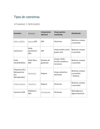1) Las coenzimas son moléculas orgánicas no proteicas que transportan grupos químicos entre enzimas como intermediarios metabólicos.