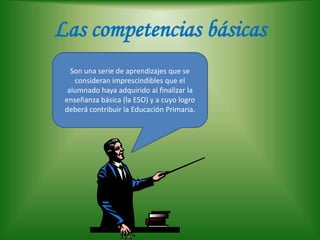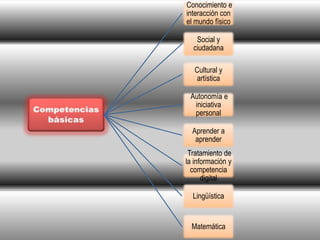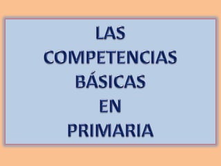 Este documento describe las competencias básicas que se espera que los estudiantes hayan adquirido al finalizar la educación primaria. Identifica ocho competencias básicas, incluyendo el conocimiento del mundo físico, la competencia social y ciudadana, la competencia cultural y artística, la autonomía personal, aprender a aprender, el tratamiento de la información y la competencia digital, la competencia lingüística y la competencia matemática. Explica que la educación primaria contribuye al desarrollo de estas competencias a través