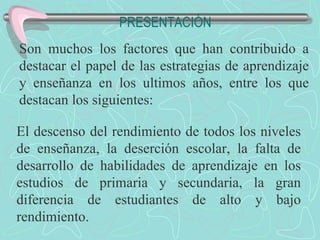 Este documento presenta un modelo pedagógico para desarrollar habilidades y capacidades cognitivas en estudiantes. Describe habilidades como la solución de problemas, la creatividad y la metacognición. Explica que los maestros deben encontrar formas de enseñar estas habilidades además de los contenidos académicos. También enfatiza la importancia de que tanto maestros como estudiantes desarrollen una mayor conciencia sobre sus procesos de aprendizaje.
