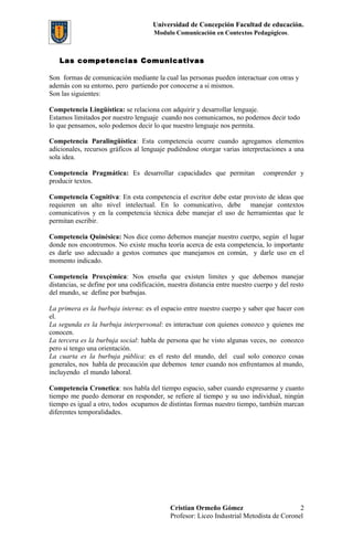 El documento describe las competencias comunicativas y sus componentes. Define las competencias como un conjunto de conocimientos, habilidades y actitudes. Explica siete tipos de competencias comunicativas: lingüística, paralingüística, pragmática, cognitiva, quinésica, proxémica y cronémica. Cada una se refiere a un aspecto diferente de la comunicación humana como el lenguaje, gestos, comprensión contextual, uso del tiempo y el espacio.