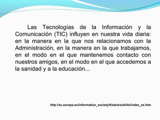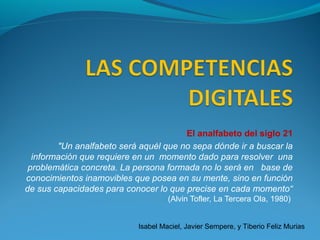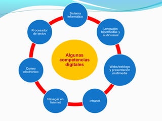 El documento habla sobre la competencia digital. Define la competencia digital como la habilidad para usar tecnologías de la información y comunicación de manera segura y crítica para el trabajo, ocio y comunicación. Explica que la alfabetización digital es una estrategia para enseñar a la población sobre las ventajas de las tecnologías y dotarles de habilidades digitales. Finalmente, menciona que la Unión Europea recomienda incluir la competencia digital entre las ocho competencias clave para el aprendizaje permanente.