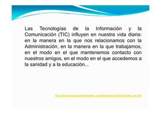 Este documento trata sobre la alfabetización digital y las competencias digitales. Define la alfabetización digital como una acción organizada para incorporar a las personas al conocimiento y actividad en torno a las tecnologías de la información y comunicación (TIC), permitiéndoles adquirir habilidades tecnológicas básicas. Explica que las competencias digitales implican el conocimiento básico del sistema informático y la gestión del equipo, así como la creación, captura y tratamiento de imágenes digitales. Finalmente, señala