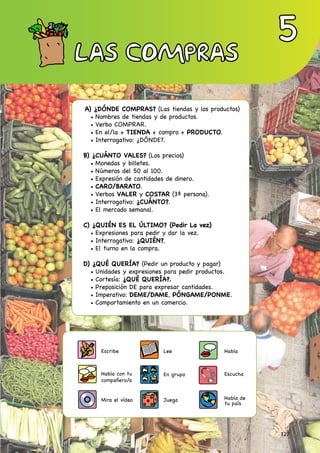 Este documento proporciona información sobre las compras. Se divide en cuatro secciones: A) lugares de compra y productos comunes, B) precios, C) pedir turno en la tienda, y D) pedir productos y pagar. Incluye ejemplos de frases, preguntas y vocabulario relacionado con las compras en tiendas como la carnicería, panadería, frutería y supermercado.