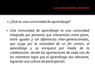 Este documento describe una comunidad de aprendizaje como una comunidad formada por personas que interactúan colaborativamente para lograr un objetivo común de aprendizaje. Explica que los elementos clave de una comunidad de aprendizaje son la interacción, la colaboración y el intercambio entre pares. Además, señala que el rol del asesor es ser un guía que facilite los recursos para que los estudiantes exploren y generen nuevo conocimiento de manera autónoma. Finalmente, resalta que una comunidad de aprendizaje