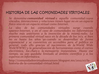 El documento habla sobre la historia, importancia y herramientas de las comunidades virtuales. Explica que las comunidades virtuales surgen con Internet en los años 70 pero no se desarrollan hasta los 90 con la web. También describe que las comunidades virtuales de aprendizaje son importantes porque generan diálogo y aprendizaje activo entre sus miembros y comparten información relevante. Finalmente, menciona herramientas digitales comunes como wikis, blogs y videos educativos que se usan en comunidades virtuales.