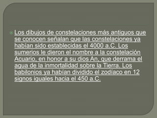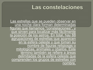 El documento describe las constelaciones y el zodíaco. Explica que las constelaciones son agrupaciones de estrellas que forman figuras y que se han identificado 88 constelaciones a lo largo de la historia. El zodíaco se divide en 12 signos que originalmente coincidían con constelaciones pero que ahora difieren debido a la precesión de los equinoccios.
