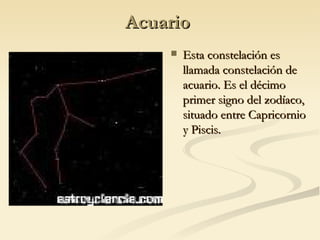 El documento describe brevemente 15 constelaciones, incluyendo Acuario, Osa Mayor, Orión, Libra, Virgo, Géminis, Leo, Capricornio, Cuerno, Delfín, Gran Bretaña y Olimpiadas, y fue escrito por Fiorella Tirasso y Julieta Cistaro.