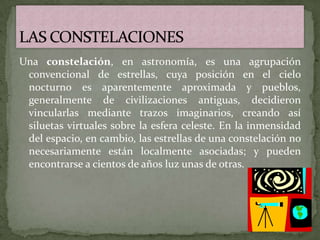 Las constelaciones son agrupaciones convencionales de estrellas cuya posición aparente en el cielo nocturno fue vinculada por civilizaciones antiguas, aunque las estrellas pueden estar a años luz de distancia entre sí. Andrómeda es una constelación boreal nombrada por la doncella de la mitología griega que comparte una estrella con Pegaso.